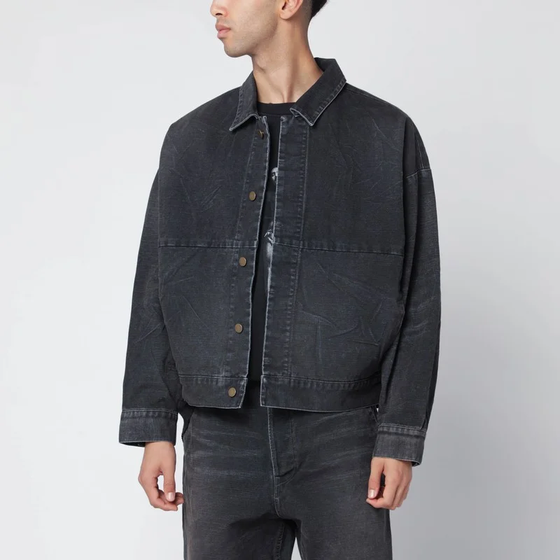 Fear of God black faded-effect canvas jacket, featuring cropped boxy fit, hidden front closure, shirt collar, long sleeves, embossed logo label on the back, and two side pockets.