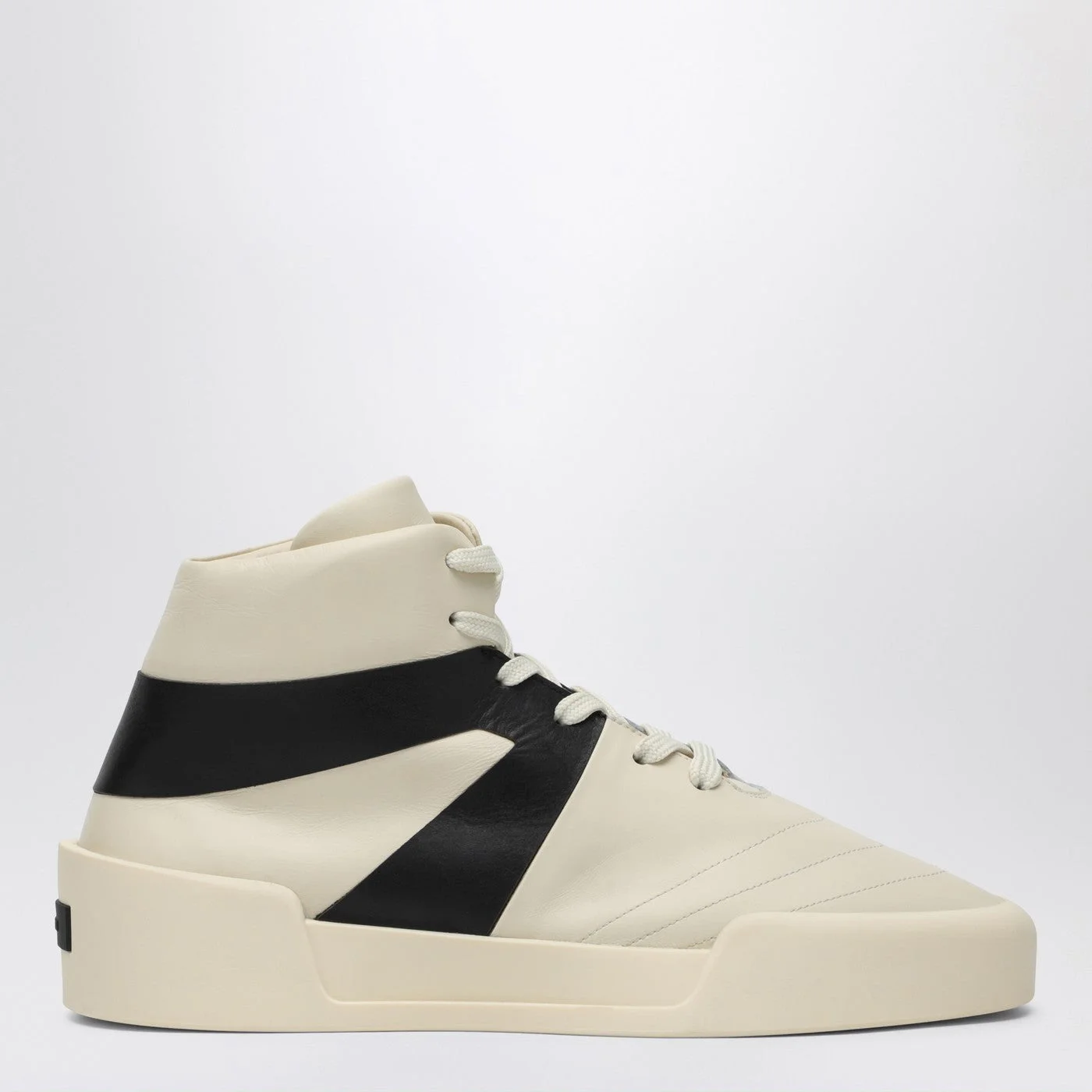 Cream coloured leather sneaker from Fear of God featuring lace-up closure round toe contrasting black details and rubber sole with logo patch on back.