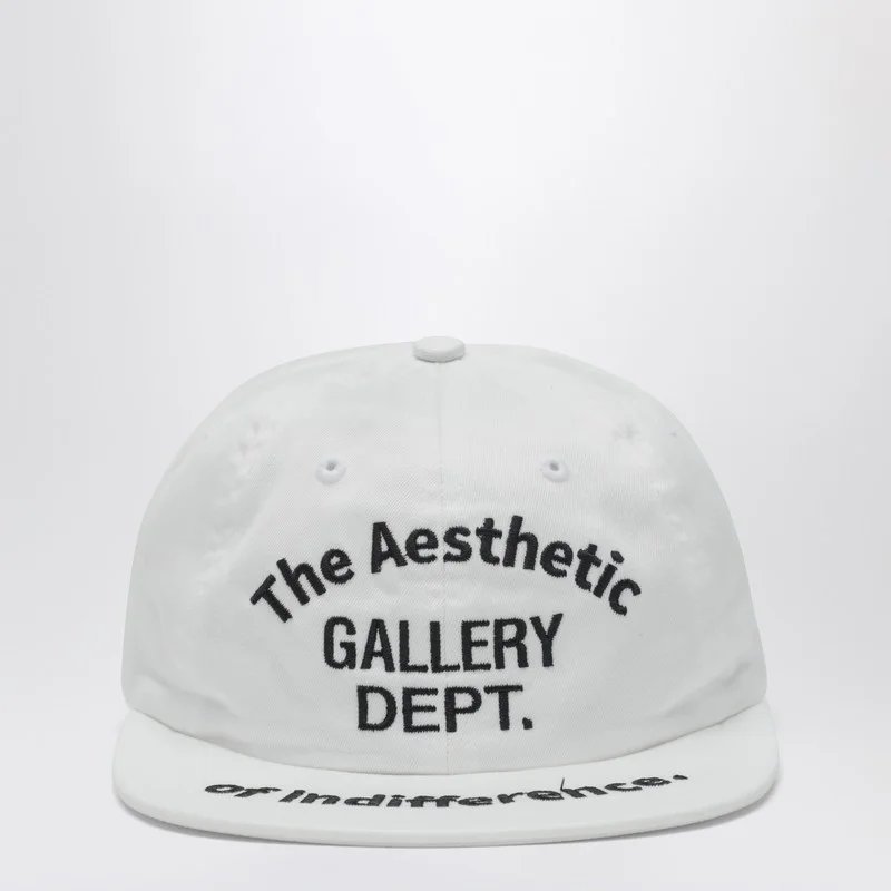 White cotton cap by Gallery Dept. featuring contrasting logo lettering embroidery on the front and visor, and an adjustable back strap.