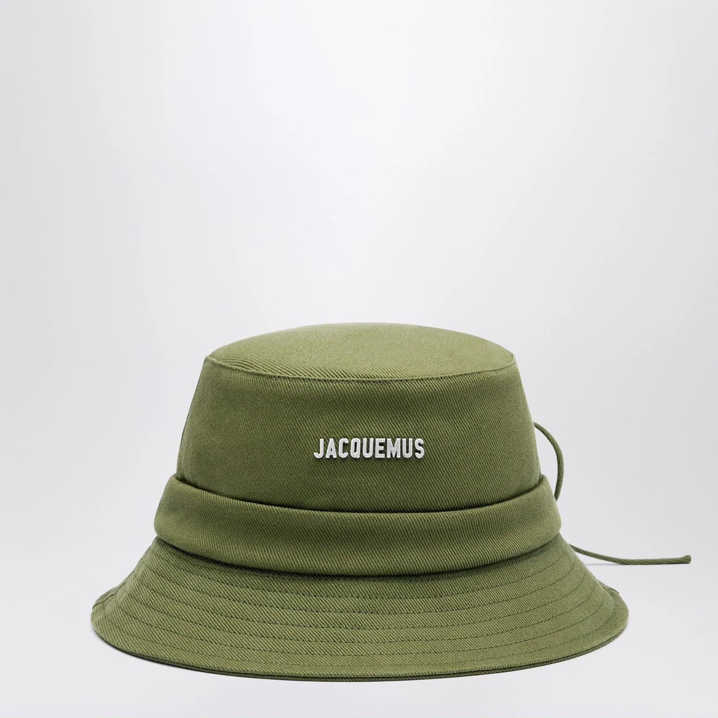 Jacquemus khaki cotton hat featuring a metal logo detail on the front and a back bow.