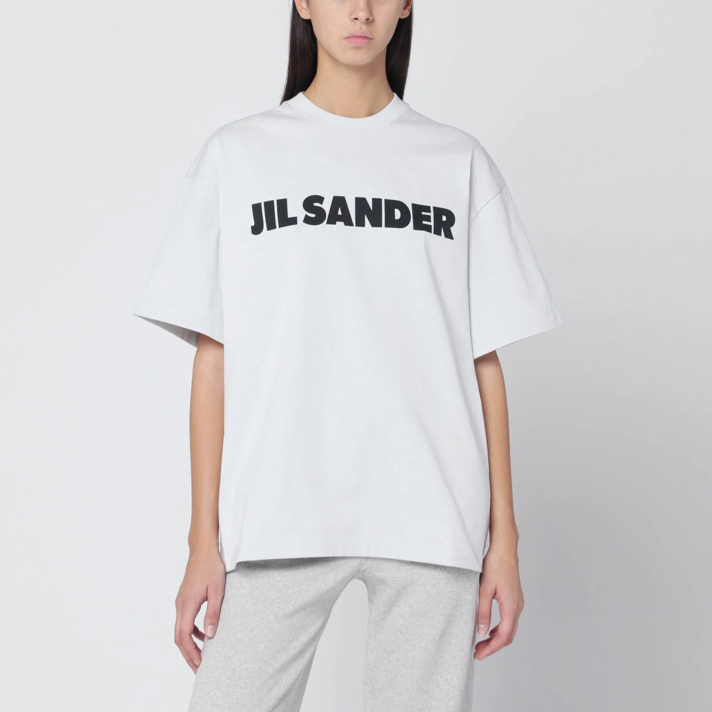 Light grey cotton T-shirt by Jil Sander featuring wide short sleeves ribbed crew neck contrasting logo lettering print on the front and an oversized fit.