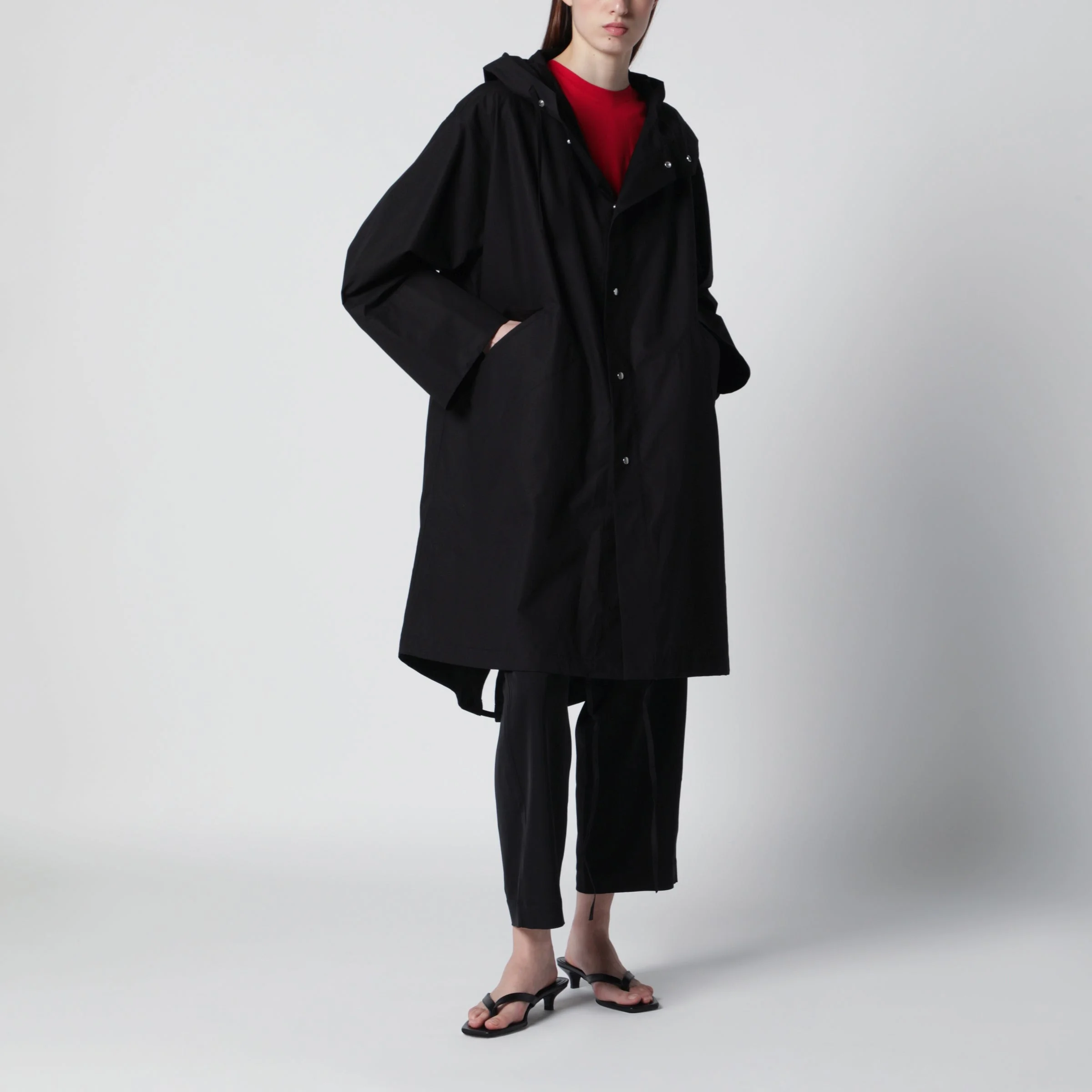 Oversized midi parka in waterproof cotton by Jil Sander• Color: Black• Hood• Snap button closure• Drawstring waist• Two flap pockets with reinforced stitching detail• Elasticated cuffs• Pleated detail on the elbows• Rounded hem shorter at the front• Jil Sander logo printed on the back