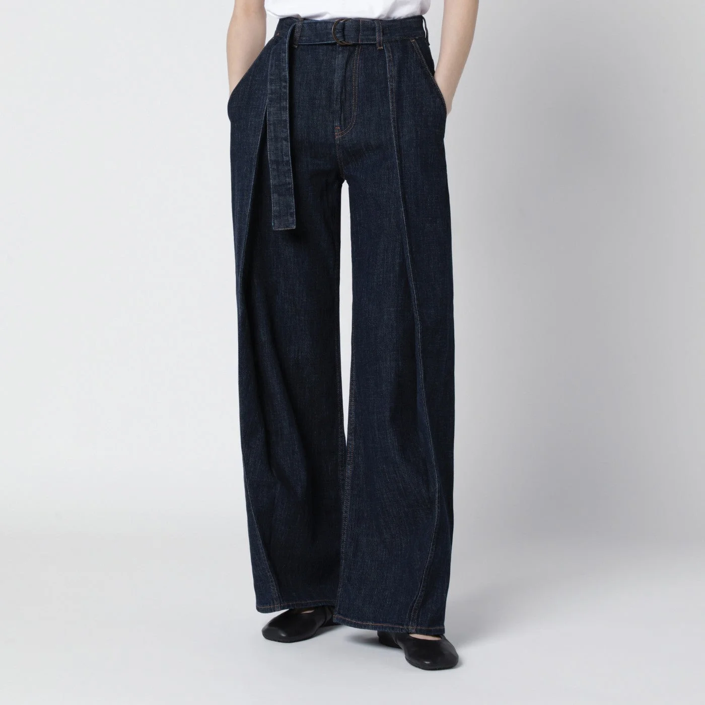 Jeans by Loewe in indigo blue cotton denim featuring an adjustable belt with engraved logo D-ring front pleats regular fit regular length mid-rise waist straight leg front closure two side welt pockets two rear patch pockets rear logo patch and contrast stitching.