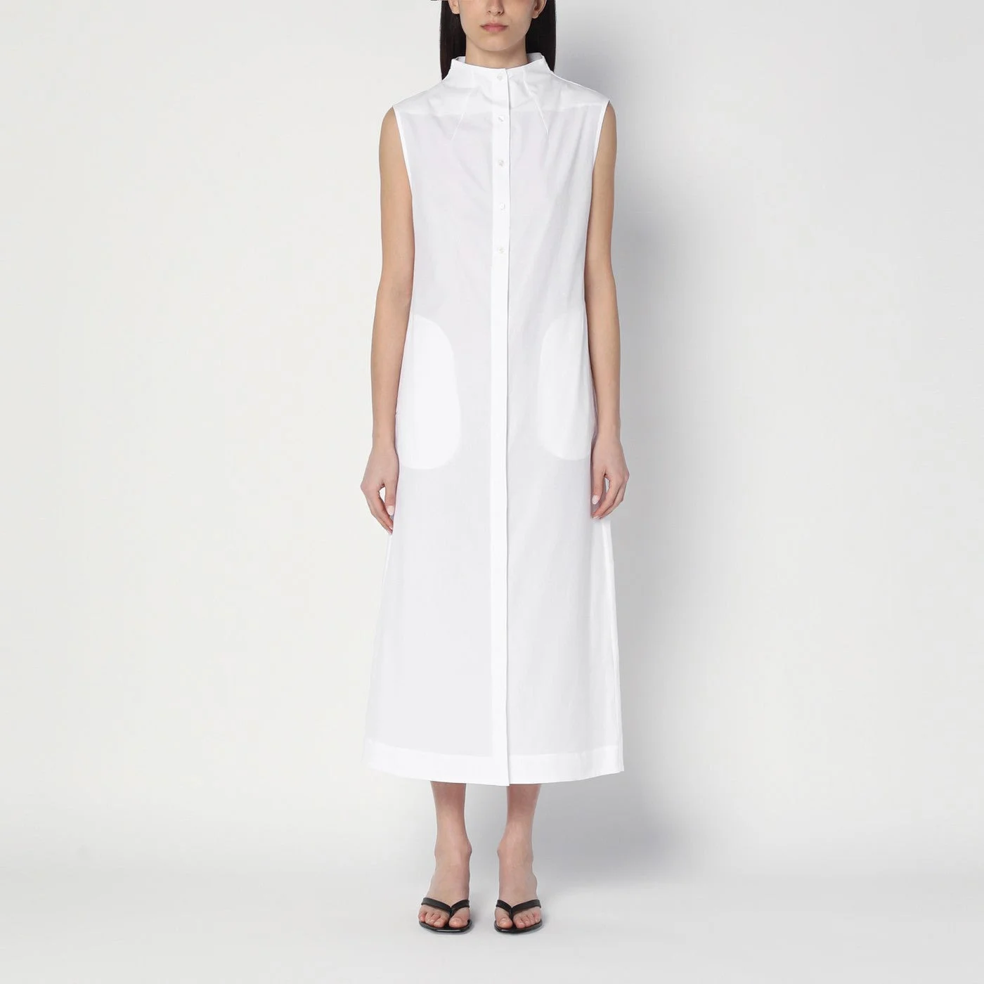 Sleeveless shirt dress by LouLou de Saison in white cotton featuring a front closure two side welt pockets and a raised collar.