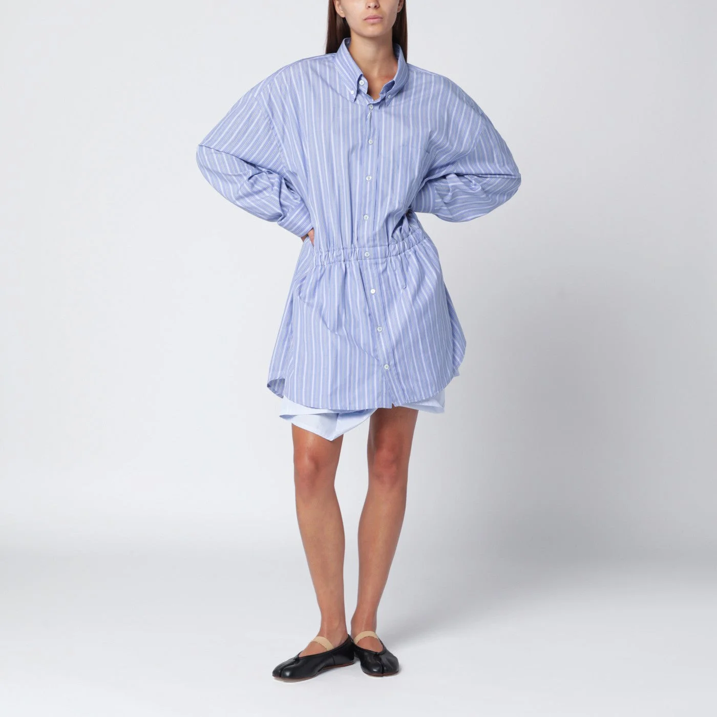Maison Margiela light blue cotton striped shirtdress featuring ruched waist detail long sleeves with buttoned cuffs double-layer curved hem chest patch pocket button-down collar and Four Stitches logo at the back.