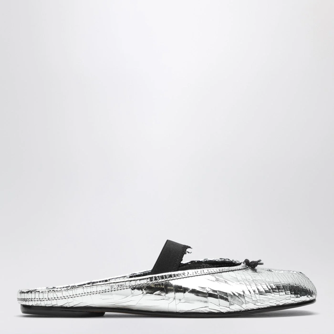 Mules by Maison Margiela in silver leather with a cracked effect characterized by a cotton knot at the front Tabi cut rounded toe elastic fabric with frayed edges and leather sole.