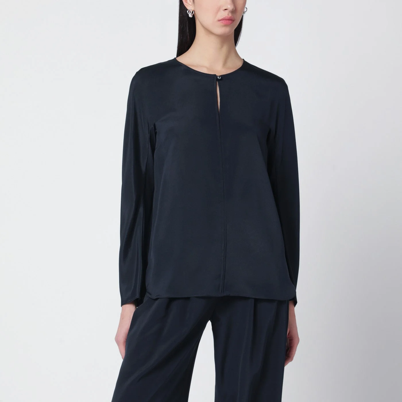 Blouse by Max Mara in midnight blue silk blend• Long sleeves• Crew neckline with small button• Front cut-out detail