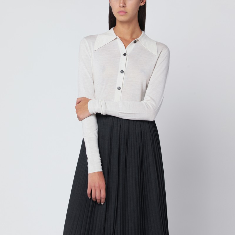 MKDT Studio cardigan in stone-coloured wool, featuring long sleeves, wide collar, front button closure, and ribbed trims.