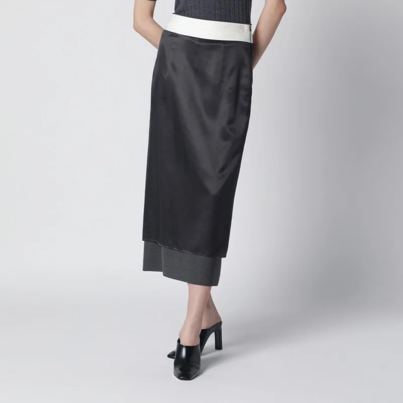 Dark grey melange virgin wool midi skirt by Rohe, featuring an inverted design revealing the outer lining, a contrasting waistband detail and a zip closure.