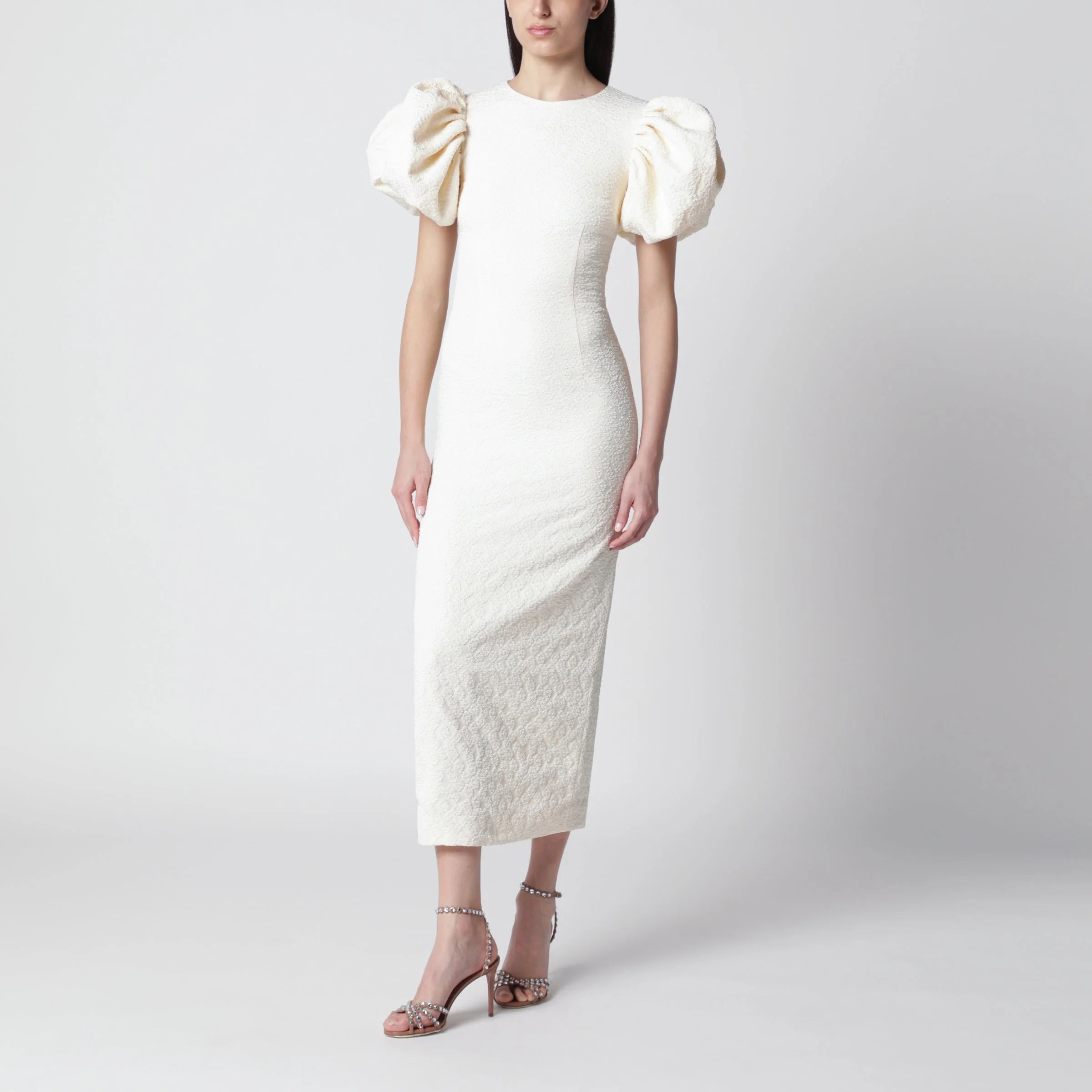 Puffed jacquard midi dress by ROTATE• Color: White• Round neckline• Short puff sleeves for added shoulder volume• Fitted midi silhouette with straight skirt falling below the knee• All-over jacquard texture with delicate floral motif• Concealed back zip closure