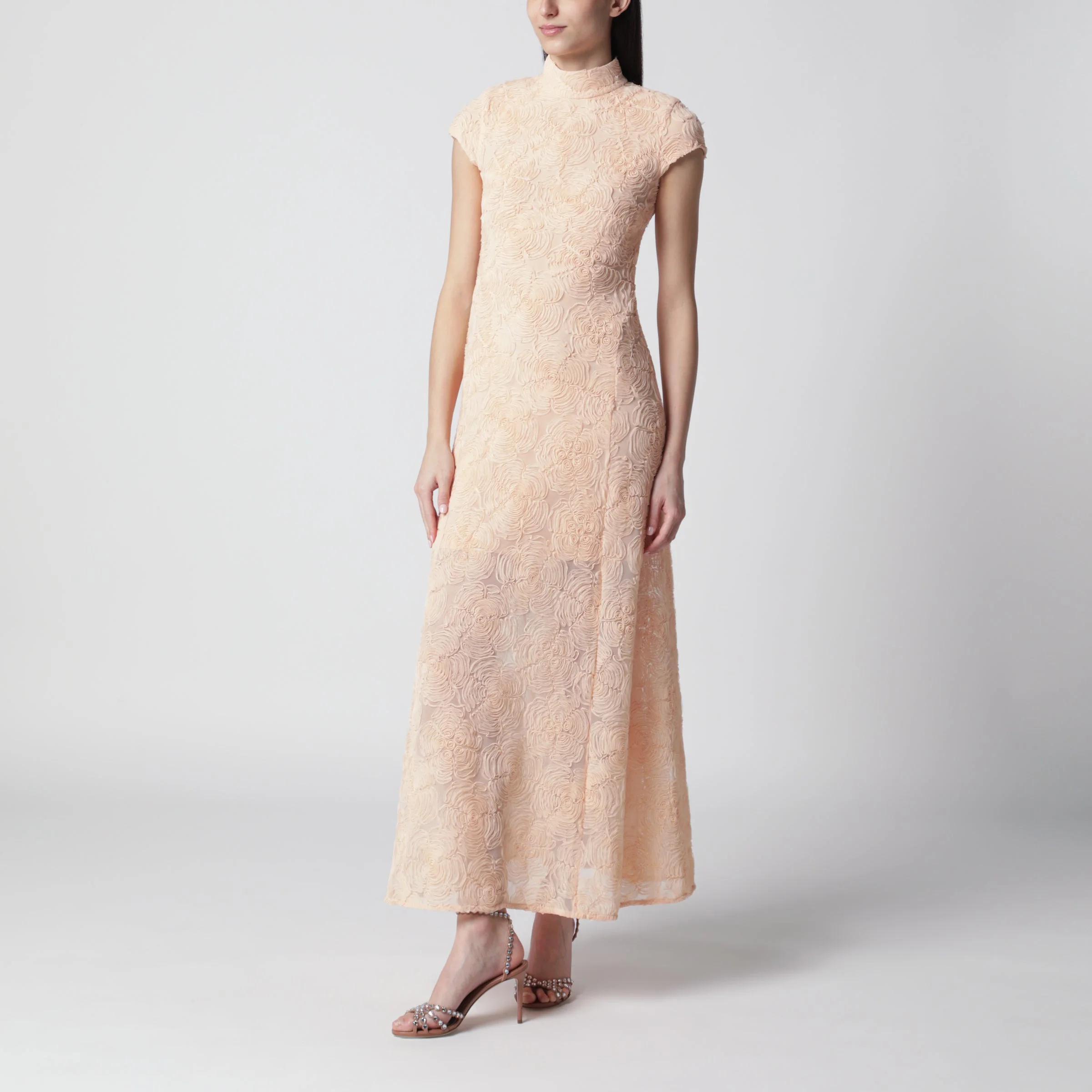 Long dress by Rotate in mesh• Color: Vanilla Cream• High neck• Short sleeves• Back zip closure• Tone-on-tone floral embroidery