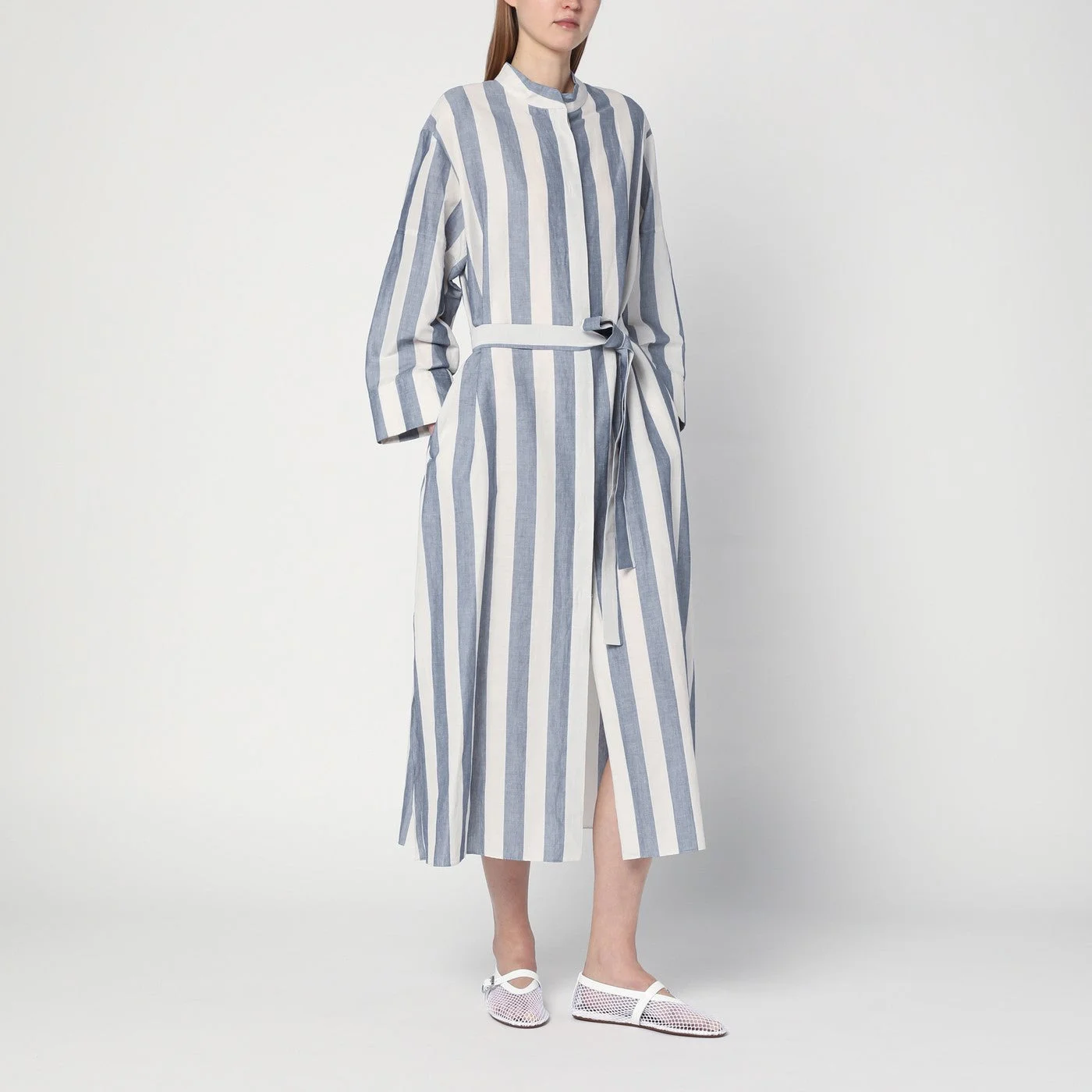 Midi shirt dress by 'S Max Mara in ramie and cotton in light blue and white stripes featuring a hidden front button closure long sleeves with buttoned cuffs a tie belt at the waist two side welt pockets a mandarin collar and a small logo patch on the back.