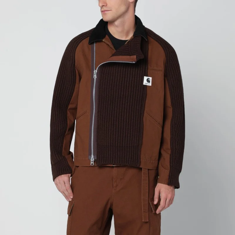 Carhartt WIP jacket made in collaboration with Sacai in brown wool blend knit with beige cotton inserts, featuring corduroy collar, double zip closure, long sleeves with adjustable cuffs, two front welt pockets, one chest welt pocket, hem with snap buttons, and logo patch on the chest.