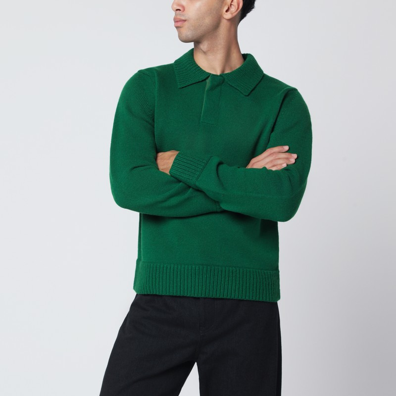 Sacai green wool sweater, featuring polo-style collar with concealed front closure, long sleeves, rear logo patch detail and ribbed trims.