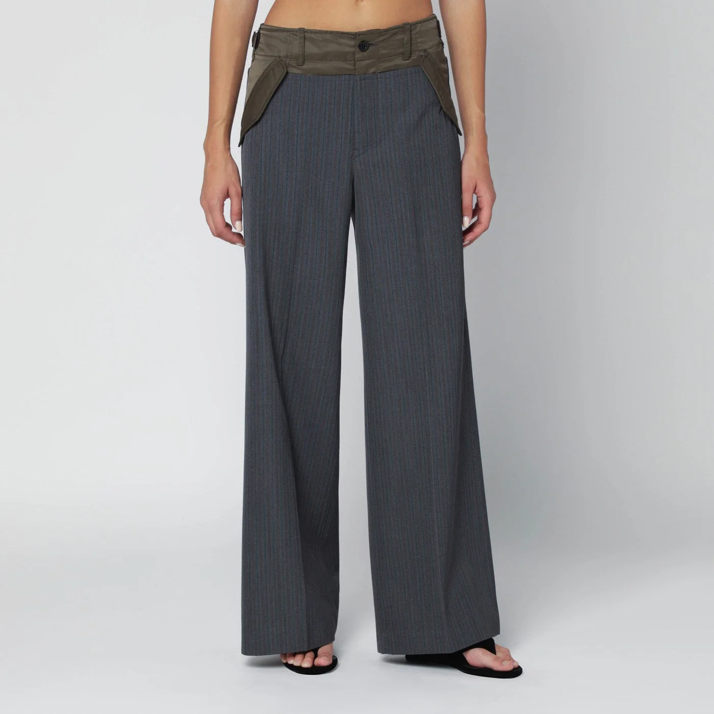 Sacai trousers in grey pinstripe wool blend featuring contrasting khaki green nylon part front zip and button closure belt loops two front flap pockets two back welt pockets with button and adjustable waist straps.