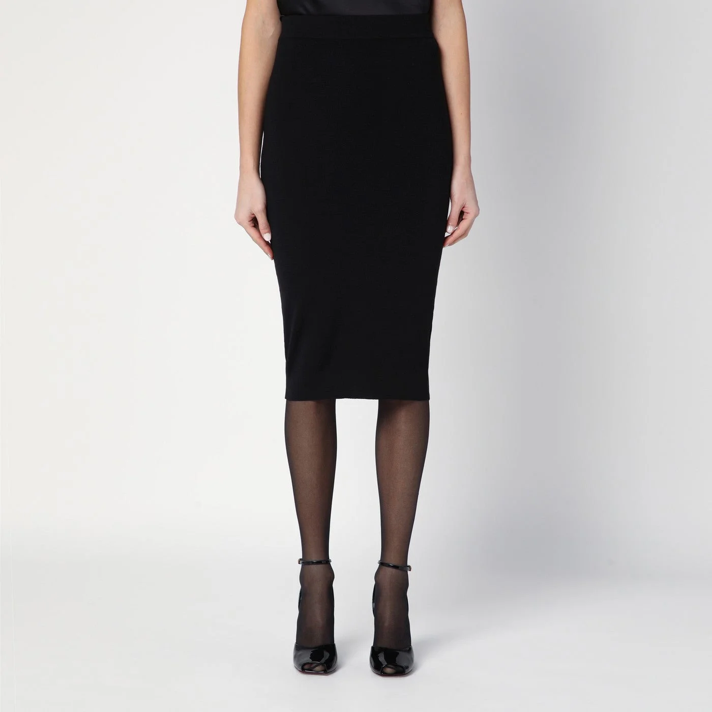 Black wool Saint Laurent pencil midi skirt featuring an elasticated high waist and ribbed design.