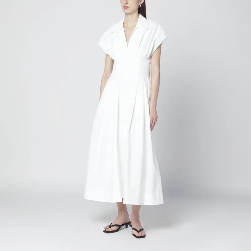 Simkhai white cotton-blend faille midi dress featuring short cap sleeves, open collar with V-neckline, fitted waist design, front zip closure, two side pockets and pleated bodice.