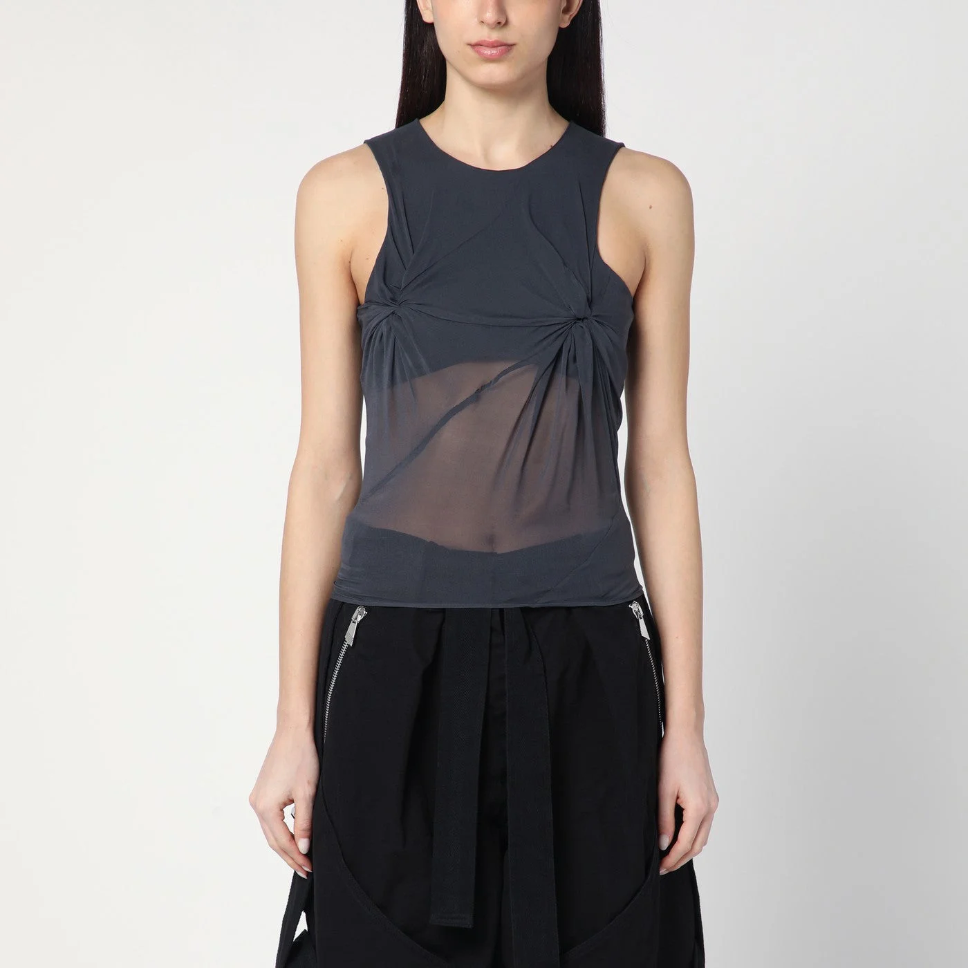 Round-neck tank top by The Attico in grey silk characterized by a logo patch on the back gathered detail on the bust and semi-transparent design.