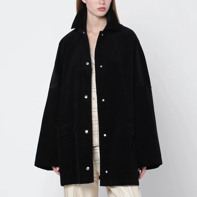 Black ribbed organic-cotton velvet jacket by TOTEME, featuring silver-tone snap buttons, wide long sleeves with dropped shoulders, two front flap patch pockets, a shirt-style collar, and an oversized fit.