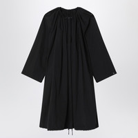 Lightweight black cotton-blend coat by TOTEME, made from organic cotton, featuring drawstring neckline and hem, front zip and snap-button closure, pleated front design, long sleeves with snap cuffs, and two side pockets.