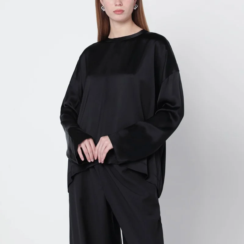 Black satin crew-neck blouse by TOTEME, featuring wide long sleeves with dropped shoulders, a relaxed boxy silhouette, and a back zip closure.