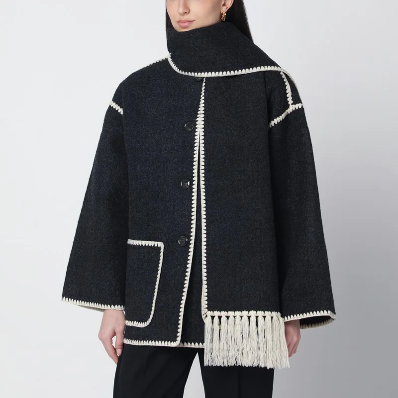 Dark gray melange wool-blend jacket by TOTEME, featuring a scarf with fringed edges, wide long sleeves, two front patch pockets, oversized fit with dropped shoulders, side pockets, and contrasting embroidered details.