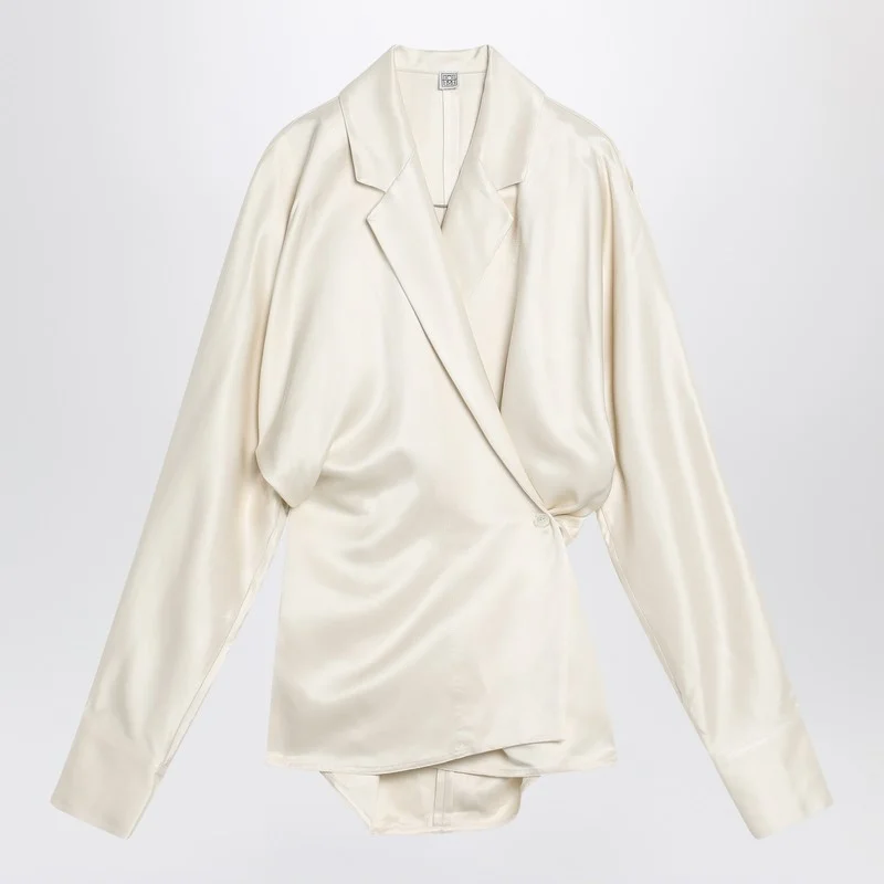 Ecru viscose satin blouse by TOTEME, featuring long sleeves with buttoned cuffs, crossover design with side button, and classic jacket-style lapels.