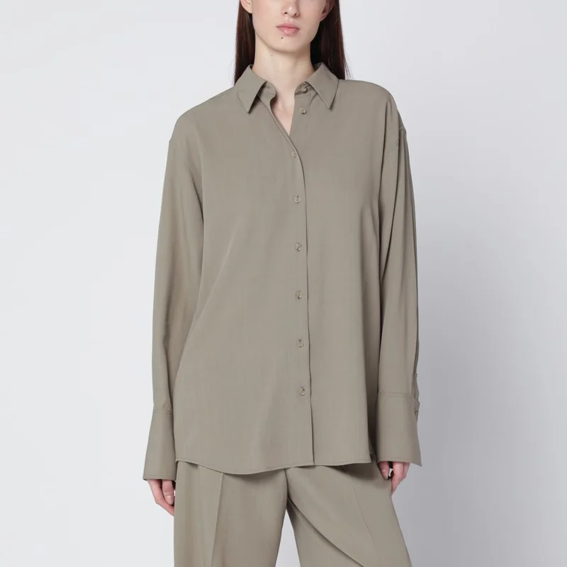 Taupe wool-blend shirt by TOTEME, featuring front button closure, classic collar, and long sleeves with buttoned cuffs.