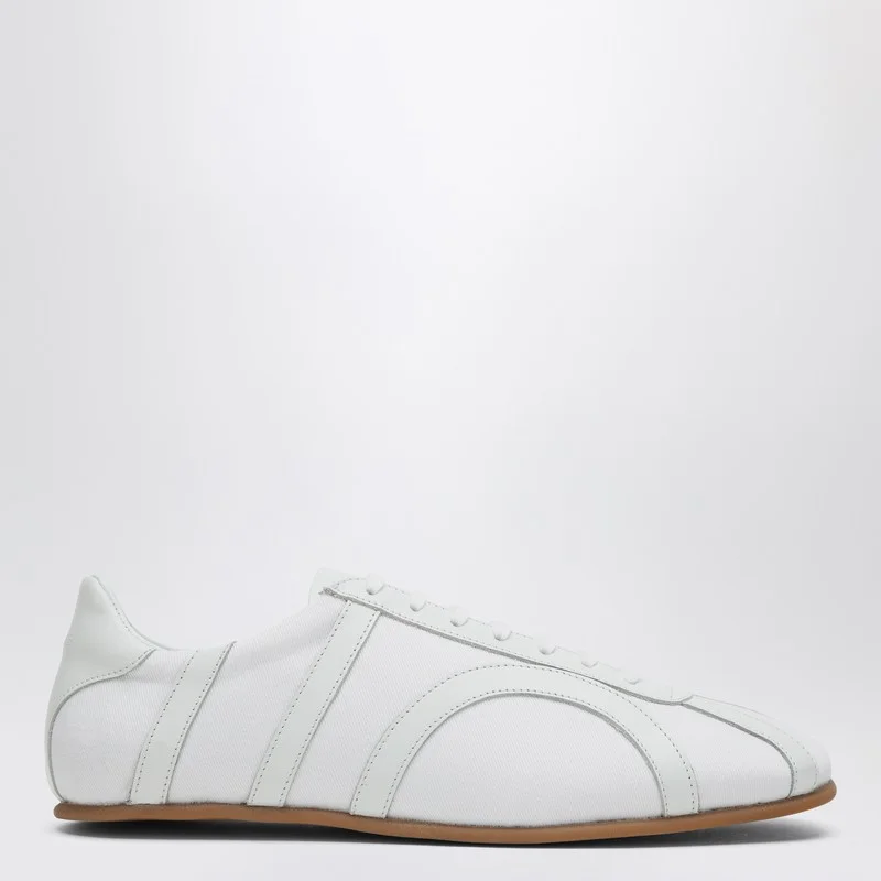 White textile sneakers by TOTEME, featuring tone-on-tone Monogram leather inserts, lace-up fastening, square toe, and rubber sole.