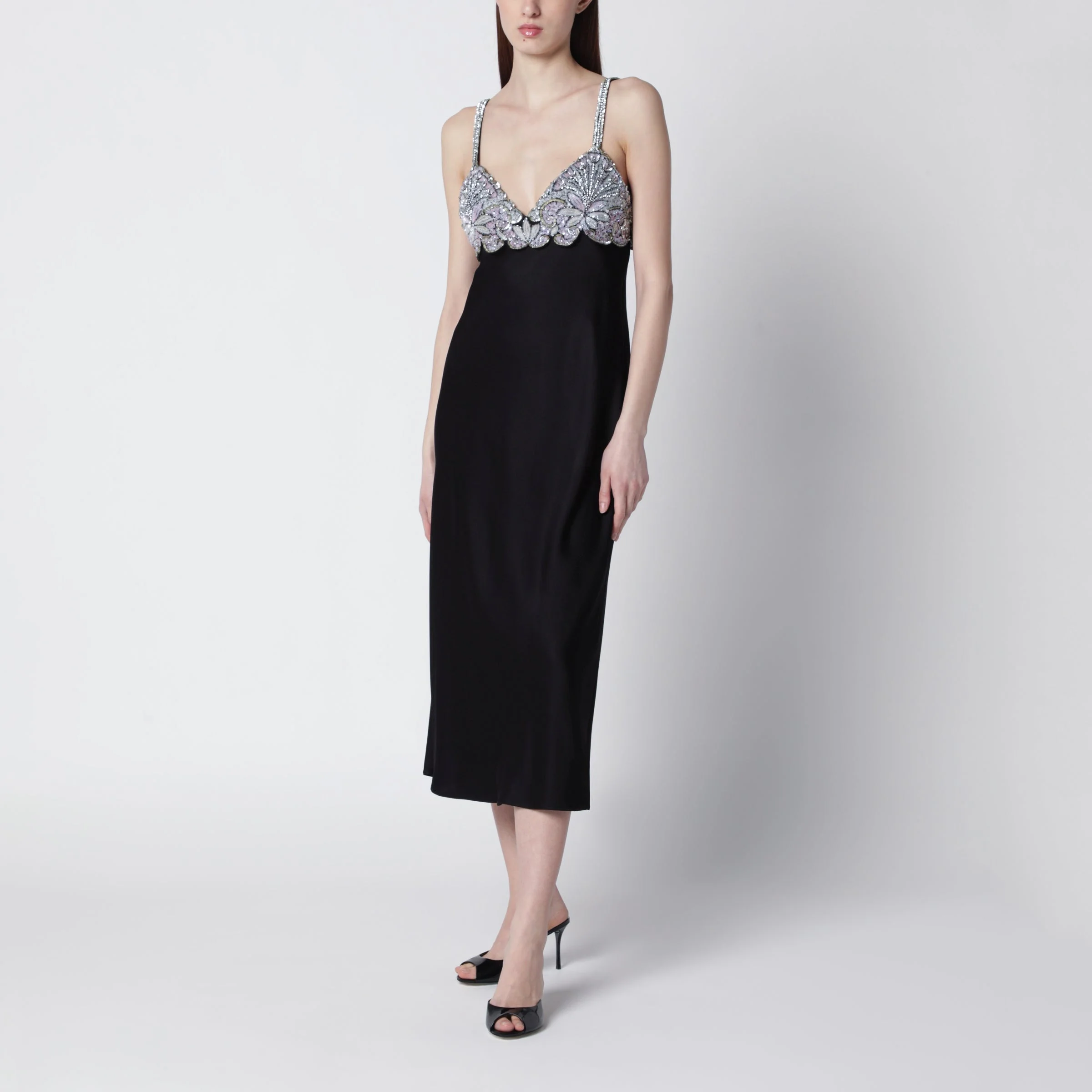 Black midi dress with lace and crystals