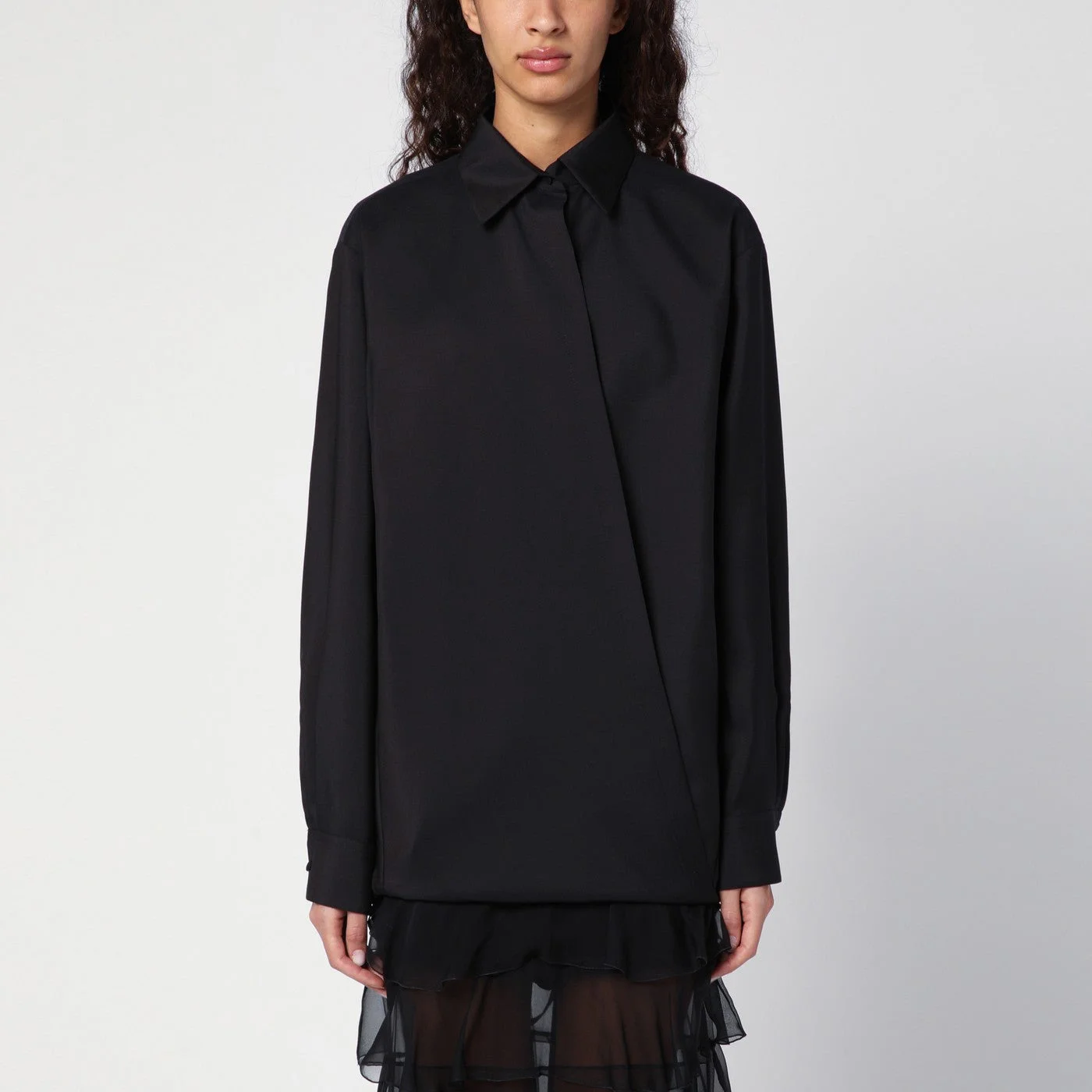 Black wool mohair and silk shirt by Valentino featuring a classic collar long sleeves with buttoned cuffs drawstring at the bottom of the garment and cross-over placket at the front.