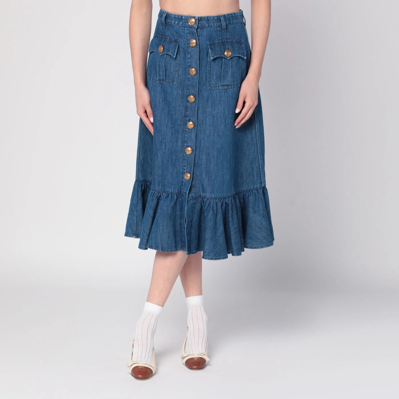 Valentino's midi skirt in a blue cotton-linen blend denim featuring two front patch pockets with flap and button belt loops at the waist front closure with branded buttons and a logo patch at the back.
