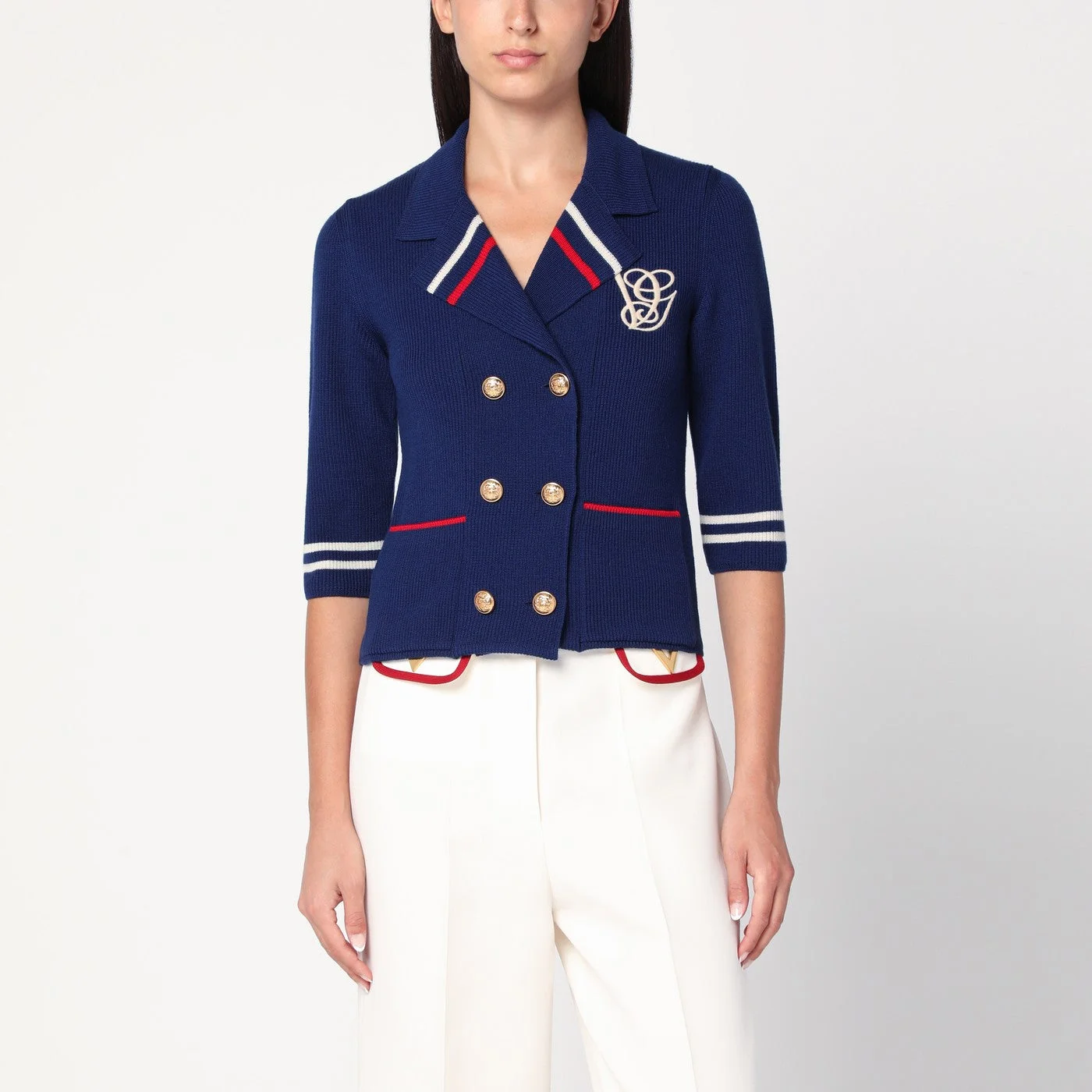 Valentino cardigan in blue virgin wool featuring a classic jacket-style lapel contrasting ivory and red details three-quarter sleeves front closure with branded golden buttons ribbed design two front patch pockets and contrasting logo embroidery on the chest.
