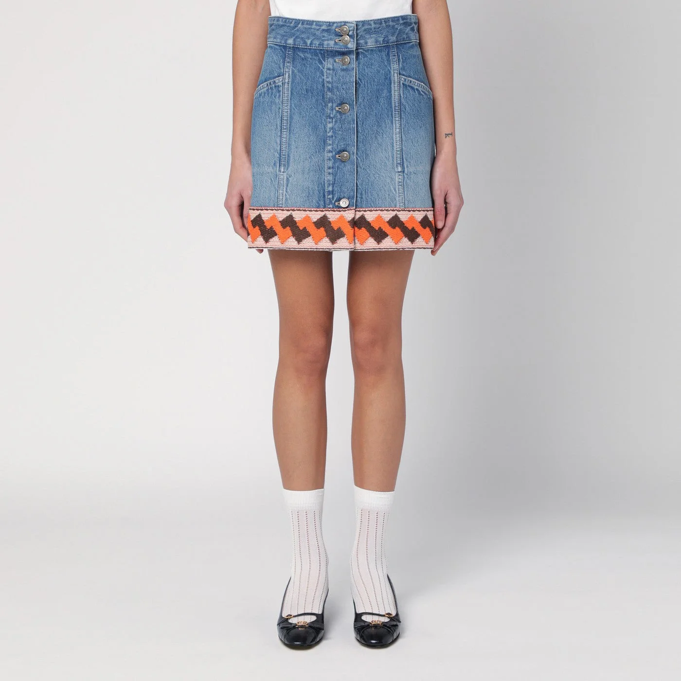 Valentino mini skirt in faded blue cotton denim characterized by a high waist front button closure two side pockets and contrasting jacquard trim.