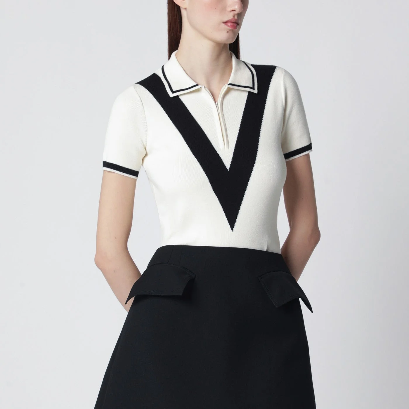 Polo by Valentino Garavani in ivory and black cotton• Polo collar• Front zip closure• Intarsia V detail at the front• Short sleeves• Ribbed hem