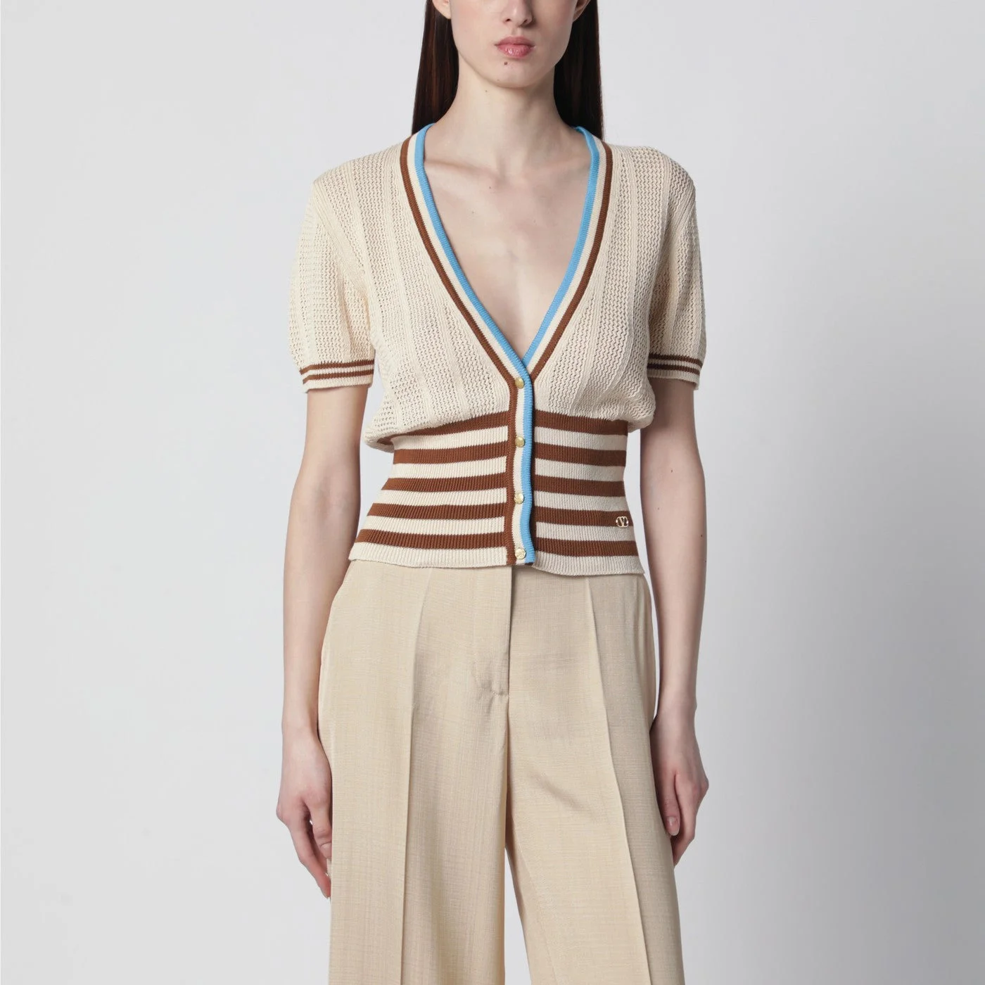 Short-sleeved cardigan by Valentino Garavani in ivory cotton with open-knit design• Contrast stripe details• Front button fastening• Vlogo Signature metal detail in gold finish at the front