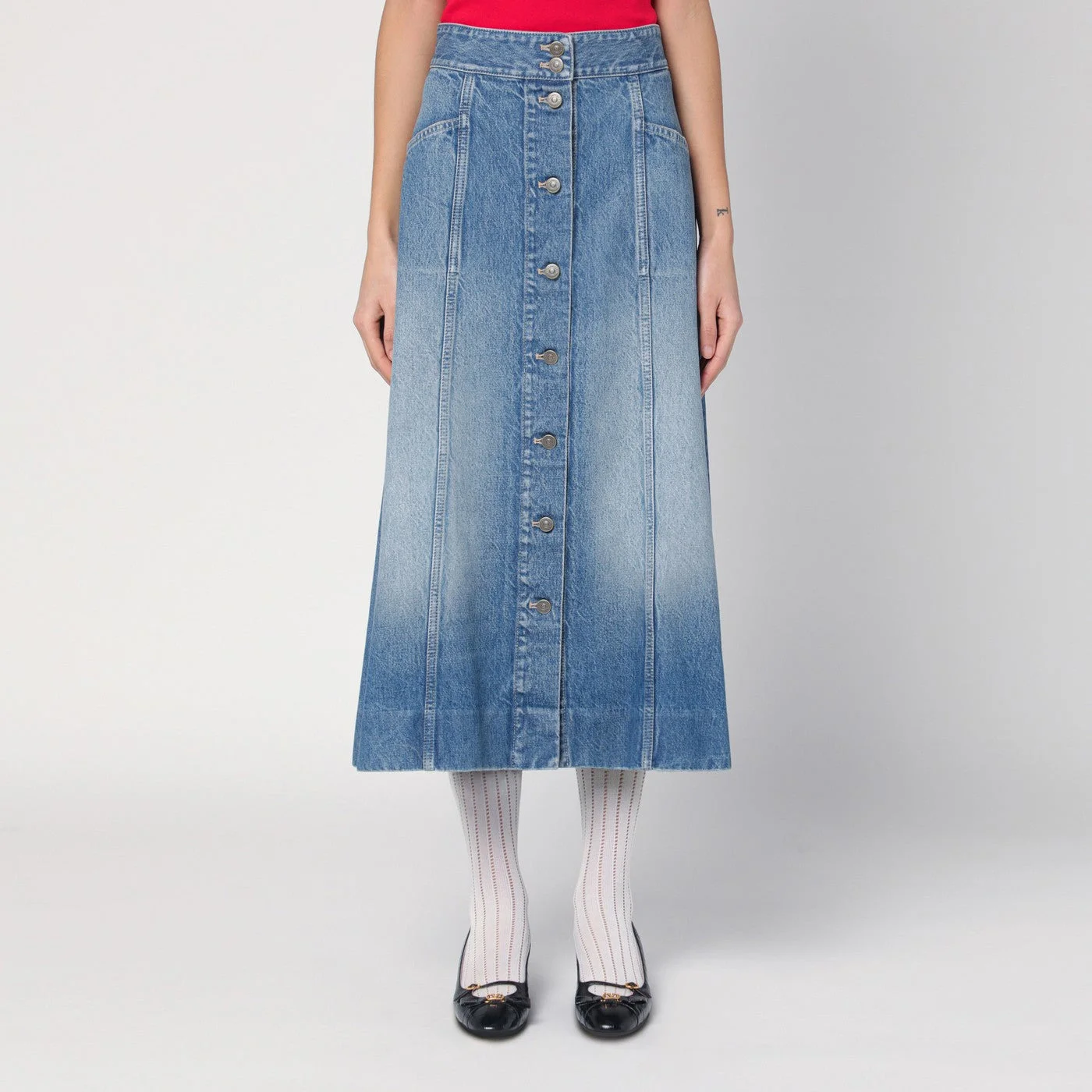 Blue washed-out cotton denim midi skirt from Valentino featuring a high waist a front button fastening and two side pockets.