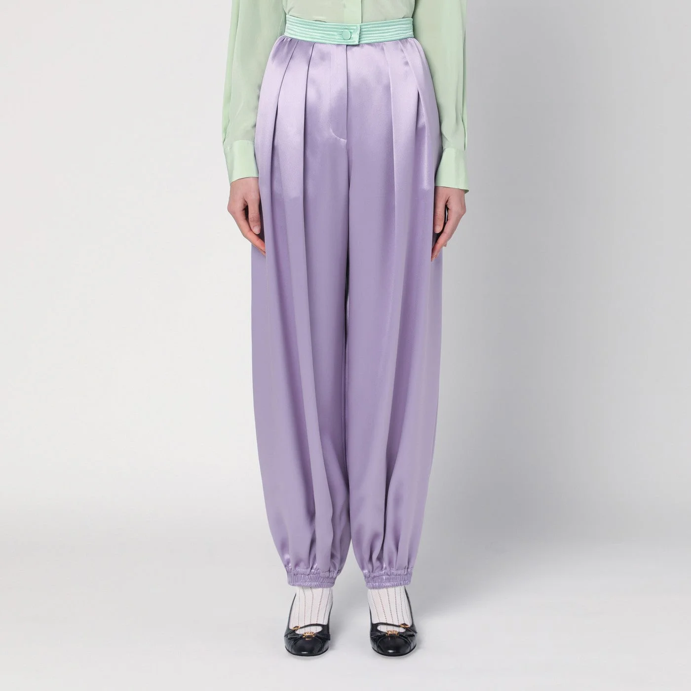 Wide pants by Valentino in lilac silk characterized by a front closure with zip and button high contrasting waist two side welt pockets two back welt pockets elasticized ankles and pleats at the front.