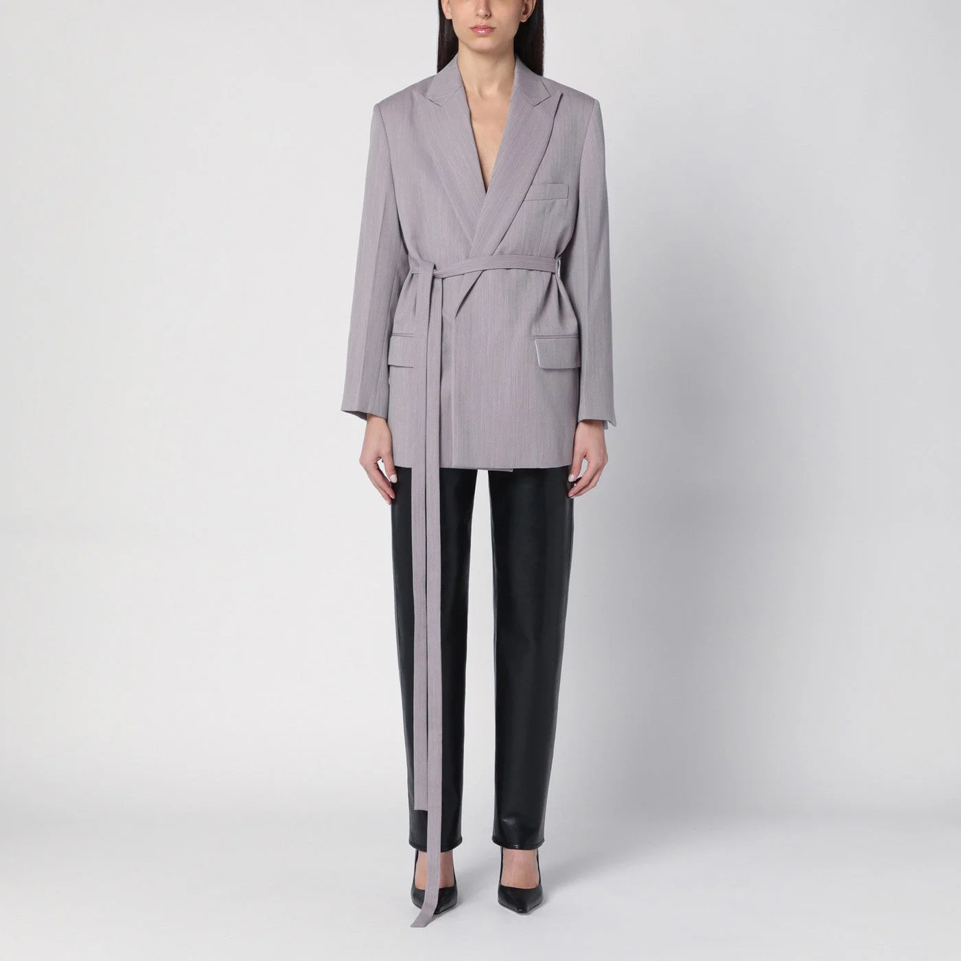 Light grey virgin wool Victoria Beckham jacket featuring peaked lapels a welt pocket on the chest two flap pockets on the front and a belt at the waist.