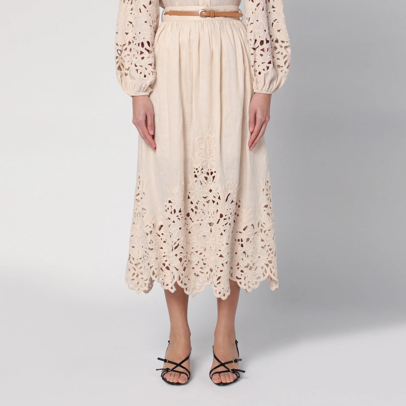 Cream linen midi skirt from Zimmermann featuring concealed back zip fastening waist loops removable belt pleated details two side welt pockets and scalloped hem.