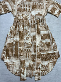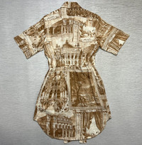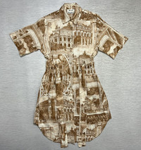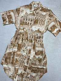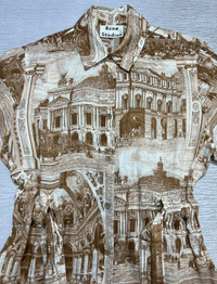 Acne Studios - Spring-Summer 2019 - Della Theatre Linen Dress Tagged Size: 34 Gently Used Good Condition *Sign of Use(Dirts. Lints.) Measurements in Inches(Laid Flat): Shoulders: 16” Width: 18” Sleeve Length: 11” Length: 39” Details: - From the runway collection: Acne Studios brown and tan linen short sleeve dress with a theatre-themed print. Collared shirt dress with button closures in front. Belted waist. On-seam pocketing at the waist. Curved hem with side split detailing. Unlined. Color: Brown/Tan. 100% Linen. Imported. Made in Portugal.