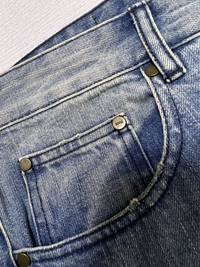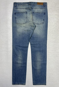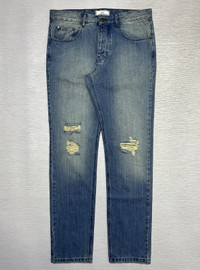 AMI Paris - Sky Blue Destroyed Denim Jeans Tagged Size: 32 Color: Sky Blue Condition: 8/10 *Sign of Use(It has a yellowish washable stain on the lower back part. Uneven fades on several parts. Washable dirts. Lints.) Measurements in Inches(Laid Flat): Waist: 17” Front Rise: 10.5” Hip: 18” Thigh: 11” Length: 43” Knee: 7.5” Inseam: 32” Leg Opening: 6.5”