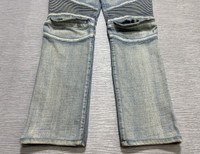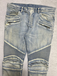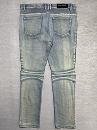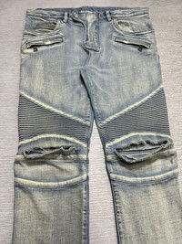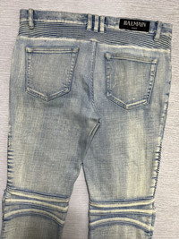 Balmain - Distressed Knee Biker Jeans Size 30 Gently Used Good Condition Normal Sign of Use *Flaws: Has washable dirts. The length is altered. Dirts. Lints. Scuffs. Scratches. I think the distressed knee is customized. No Inclusion Measurements in Inches(Laid Flat): Waist: 17” Front Rise: 10” Hip: 18” Thigh: 10” Length: 37” Knee: 7” Inseam: 27” Leg Opening: 6”