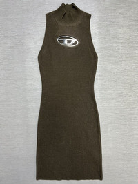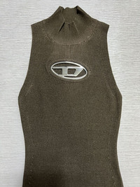 Diesel - M-Onerva Bodycon Mini Dress Size Medium Gently Used Good Condition Normal Sign of Use No flaws No Inclusion Measurements in Inches(Laid Flat): Shoulders: 9.5” Width/Chest: 12.5” Waist: 11” Hip: 13” Length: 34.5” Hem: 14” Details: - Diesel, a brand renowned for its rebellious and unconventional luxury, presents the M-Onerva Mini Dress. Adorned with a silver-tone logo plaque at the chest exuding a designer stamp. From upscale events to cocktail parties, this mini dress radiates luxury and style. Embrace modern elegance with the high neck and sleeveless design. Two-tone ribbed knit boasts a contemporary silhouette. Composition: 83% viscose, 17% polyester.