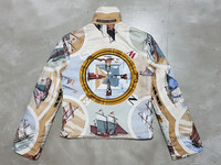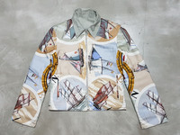 Hermès Paris by Maison Margiela Sailboat and Lighthouse Printed Silk & Cotton Reversible Jacket - It's time to set sail and explore the open seas; this Hermès reversible jacket is coming with you. Crafted with cosy silver hardware, the relaxed style is printed with an enlarged sailboat print to guide you through the waves. Make use of its reversible design by swapping to the silver shell on your days ashore. Featuring a front zip fastening with two side notches and two side pockets and another two zip pockets on reverse, gentle drop shoulder, fabric is silk, multiple sailboat print with a compass and a lighthouse in middle. Tagged Size: Extra Small Color: Platinum Silver Condition: 9/10 *Flaw: It has loose stitch on the right armpit that made it look like a hole but it's not that noticeable when worn.(Please refer to the detailed pictures I posted.) Material: 75% Cotton, 25% Silk Made in: France Piece like this goes for $2,500, I'm selling mine cheaper. Feel free to negotiate. Measurements in Inches(Laid Flat): Shoulder Width: 16" Width(Armpit-to-Armpit): 17" Sleeve Length: 23" Length(Shoulder to bottom): 21" Manage your expectation and buy with confidence. Take your measurements and know your size because Returns/Refunds are not allowed. Come correct all the time. All sales are final. Item will be posted by express shipping (DHL Express) with good tracking record in 1-3 business days after received cleared payment. Expect it to reach you in 3-7 business days only after item been shipped. Please leave your Phone Number and Email Address on the NOTE while making a purchase. Please check my other listings and take advantage of combine shipping rates or special discount. Thank you very much for your visit.