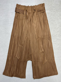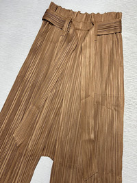 Issey Miyake - Pleats Please - Autumn-Winter 2017 - Drop Crotch Belted Pleated Trouser Tagged Size: 2, fits 24-30 Gently Used Good Condition *Sign of Use(Dirts. Creases. Scratches.) Measurements in Inches(Laid Flat): Waist: 12” Front Rise: 12” Hip: 15” Thigh: 9” Length: 30” Knee: 9.5” Inseam: 16” Leg Opening: 10” Details: •Belted trousers with elasticated waistband •Plisse effect •Two Front Side Pockets •Composition: 100% Polyester •Made in Japan
