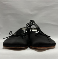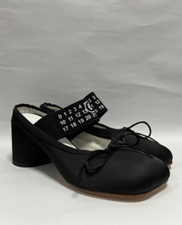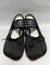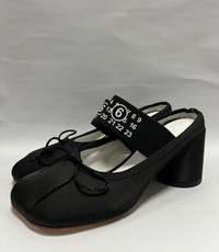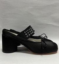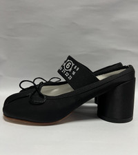 MM6 Maison Margiela - Logo Strap Bow Detail Mules Size 38 Gently Used Good Condition Normal Sign of Usage Uppers: Dirts. Minor scratches. Sole: Minor heel drag. Minor peeling on the protective tape. No Inclusion Details: - Made of leather and fabric, this model sits on a beige leather sole and features a decorative toe, a bow and an elasticized strap with a printed logo. •Color: Black •Composition: Upper: 100% Polyester. Contrast: 100% Viscose. Lining: 100% Cotton. Inside: 100% Goat Leather. Sole: 100% Calf Leather. •Made in Italy
