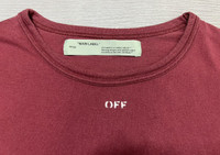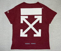 Off-White - Arrows Tee Tagged Size: Medium Color: Bordeaux Good Condition *Sign of Use(Lints. Minor crack print. Minor uneven fade on some part.) Measurements in Inches(Laid Flat): Shoulder Width: 20” Width: 23” Sleeve Length: 8” Length: 28” Details: - The arrows design has become a highly sought after print for Virgil Abloh’s Off White, returning to AW17 in 'bordeaux' red. Made in Portugal, the cotton jersey sees graphic lines highlighted throughout, with the iconic ‘OFF’ placed under the ribbed crewneck. ‘Seeing Things’ – the title of the new collection – gives a seasonal update to the legendary Arrows tee. •100% Cotton •Ribbed Crewneck •‘Off’ Chest Print •Arrows Back Print •‘Seeing Things’ Hem Print •Made in Portugal