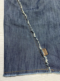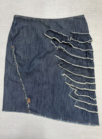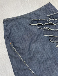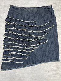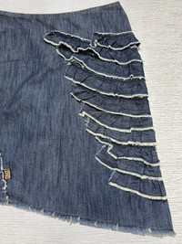 Archive W< - Ruffled Asymmetrical Mini Skirt Size 27 Gently Used Good Condition Normal Sign of Use No flaws No Inclusion Measurements in Inches(Laid Flat): Waist: 14” Hip: 16” Length: 22.5” Hem: 20” Details: - W< Jeans from early 2000s featuring Ruffled design skirt from front to back in Denim Blue Color. Side Zipper Enclosure. 100% Cotton. Made in Turkey.