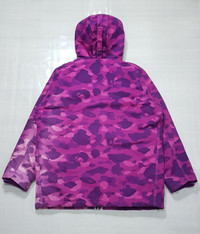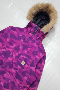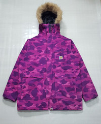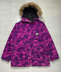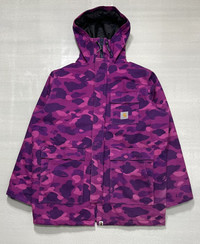 A Bathing Ape X Carhartt – 2006 - Purple Camouflage N-3B Jacket Size Large Color: Purple Condition: 9/10 *Flaw: The most notable sign of wear is a discoloration/fading which can be found at the left side of the back part of the Jacket and on the back side of the left sleeve. Please refer to all the detailed pictures I posted. Measurements in Inches(Laid Flat): Shoulder Width: 25" Width(Armpit-to-Armpit): 27" Sleeve Length: 26" Length: 32” Details: - Bape has collaborated with Carhartt way back in 2006 to bring us this N-3B jacket that comes with the most beautiful Bape camouflage color way combined with the iconic work wear canvass jacket of Carhartt. An Extremely rare piece that features Purple camouflage in heavy cotton canvas body, quilted polyester lining, polyester filling, removable faux fur collar trim, and inside pockets. •Material: Shell-100% Cotton, Lining-100% Polyester, Padding-100% Polyester. 100% Acrylic •Made In: China P.S *The buyer should expect that there will be import duties and taxes that you’ll be needing to pay.*